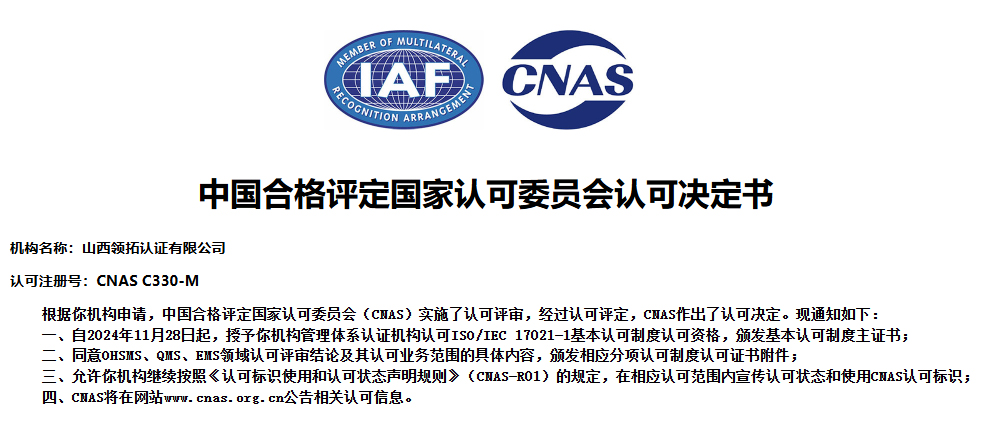權(quán)威認(rèn)可!山西領(lǐng)拓認(rèn)證機(jī)構(gòu)首次頒發(fā)帶CNAS認(rèn)可標(biāo)識(shí)的三體系認(rèn)證證書(shū)