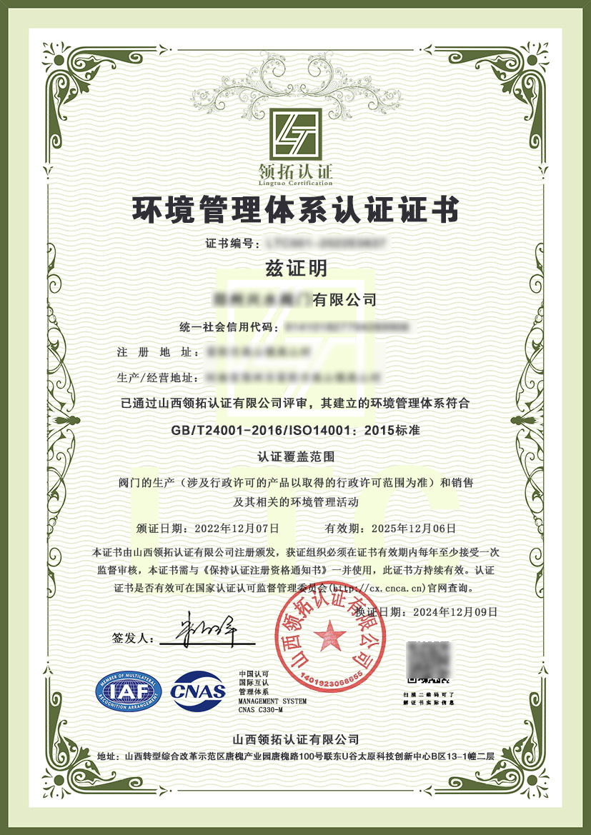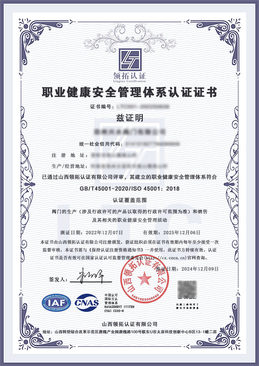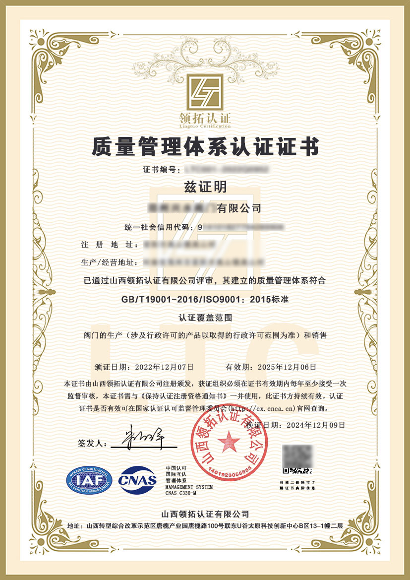 2024年12月,山西領(lǐng)拓認(rèn)證為閥門(mén)生產(chǎn)企業(yè)首次頒發(fā)CNAS三體系認(rèn)證認(rèn)可證書(shū)。未來(lái)領(lǐng)拓認(rèn)證將進(jìn)一步發(fā)揮自身在管理體系認(rèn)證領(lǐng)域的專業(yè)優(yōu)勢(shì)和影響力,為企業(yè)提供認(rèn)證領(lǐng)域技術(shù)服務(wù),提升企業(yè)核心競(jìng)爭(zhēng)力,助力企業(yè)高質(zhì)量發(fā)展!