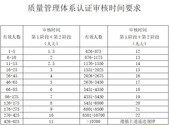 3.組織正常工作期間(如輪班制組織)安排的審核時間可以計入有效的管理體系認證審核時間,但往返多審核場所之間所花費的時間不計入有效的管理體系認證審核時間。