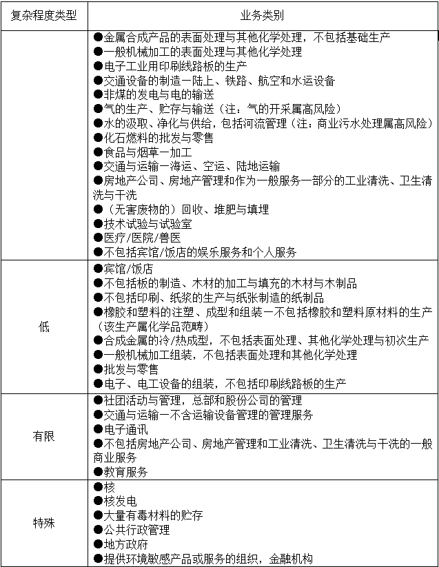 本機(jī)構(gòu)了解,在一個(gè)特定行業(yè)中,并不是所有組織都屬于相同的復(fù)雜程度類型。本機(jī)構(gòu)的申請(qǐng)?jiān)u審程序?qū)⒕哂幸欢ǖ撵`活性,以確保在確定組織的復(fù)雜程度類型時(shí)考慮該組織的具體活動(dòng)。例如:雖然化工行業(yè)的許多組織均宜被歸入“高風(fēng)險(xiǎn)”這一類,但如果某個(gè)組織只進(jìn)行不產(chǎn)生化學(xué)反應(yīng)或排放的混和作業(yè),或者只從事貿(mào)易活動(dòng),那么該組織可以歸入“中等復(fù)雜程度”甚至“低復(fù)雜程度”。本機(jī)構(gòu)記錄所有將特定行業(yè)中的組織歸入較低復(fù)雜程度類型的情況。