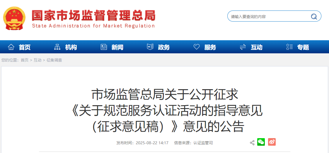 8月22日,市場監管總局發布公告,公開征求《關于規范服務認證活動的指導意見(征求意見稿)》意見,意見反饋截止日期為2025年9月21日。